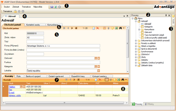 | 7. Panel nástrojů | Panel nástrojů, který slouží k ovládání jednotlivých záložek v rámci formulářů a tabulek. |